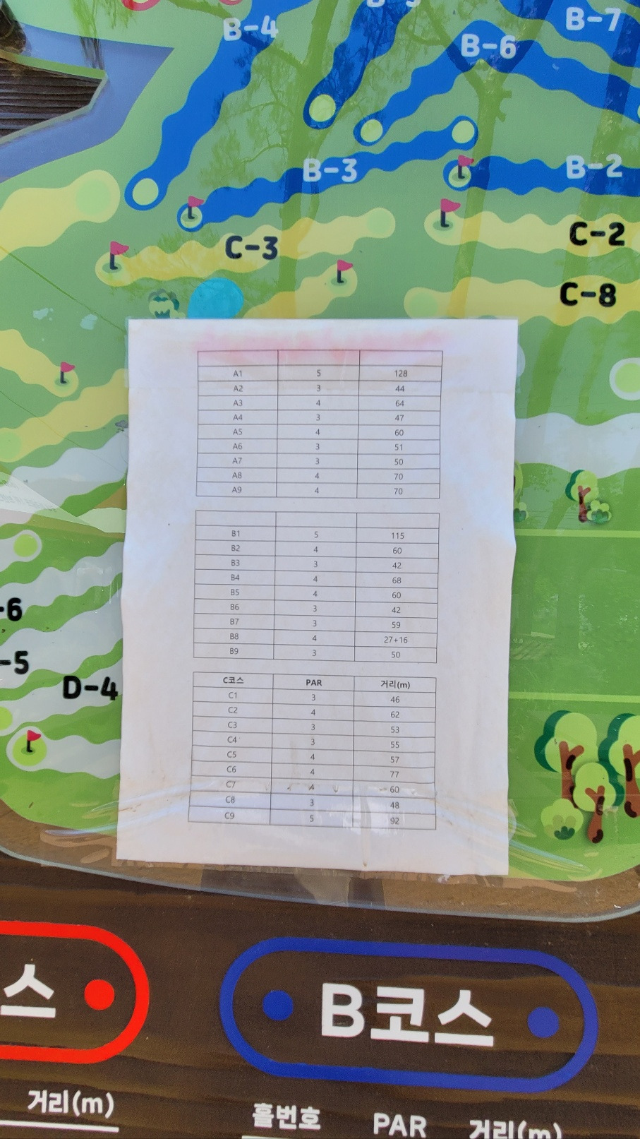 가기전에 검색을 통해 코스별 거리 적어서 스코어카드 작성해서 갔는데