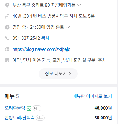 위치: 부산 북구 중리로 88-7 곰배령 가든 T.051) 337-2542