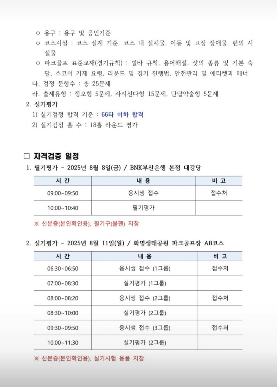 실기시험 : 8월 11일 (월) 07:00~ (화명파크골프장 AB코스)