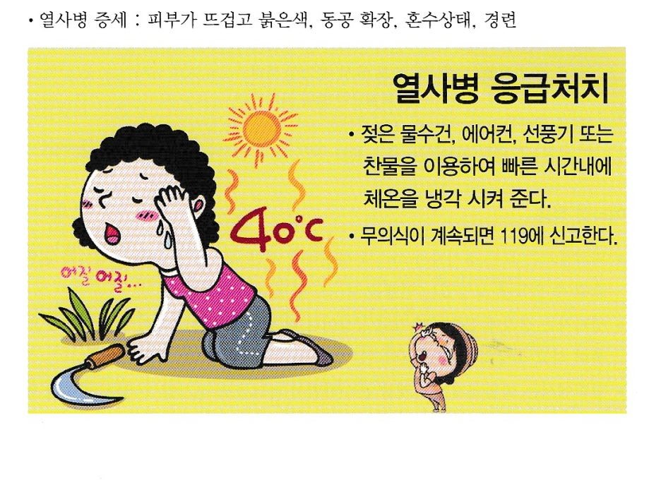 ◈주요 증상: 땀이 거의 나지 않음, 피부가 붉고 뜨거움, 의식 혼미 또는 의식 상실